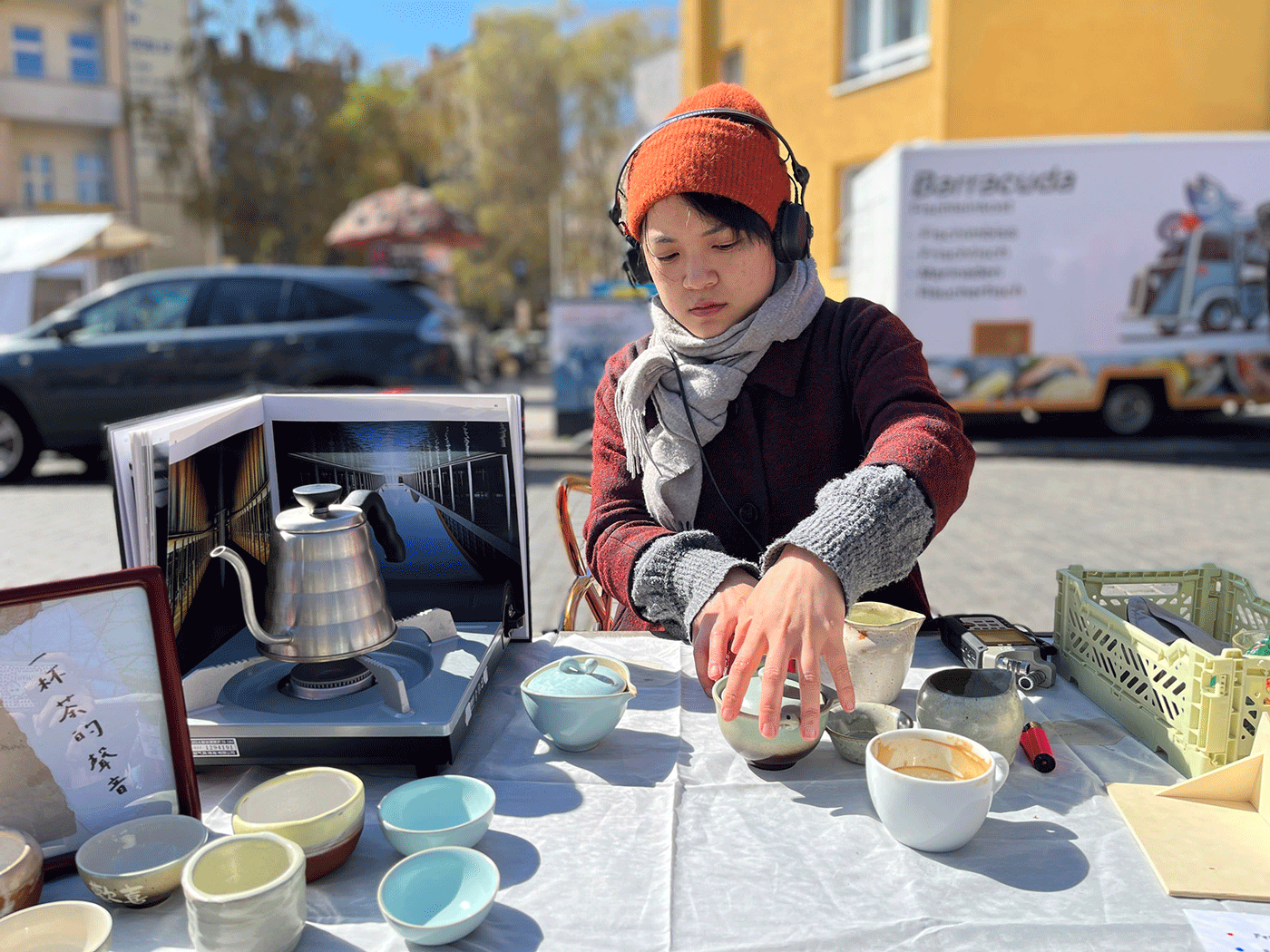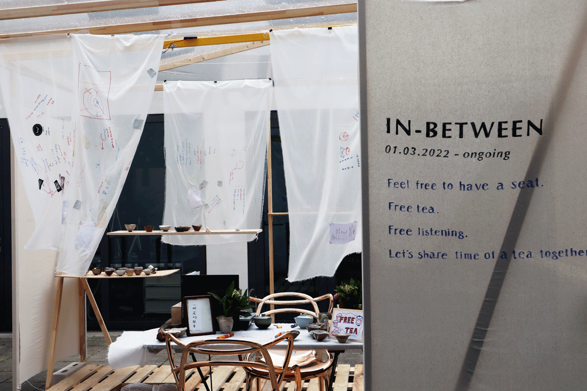 From the beginning of 2022, I started an experiment by inviting people to sit with me in a hustle market and share tea. To explore care in everyday life encounters, we practice listening together and tuning in to each other. After some months, this experiment happened in Collegium Hungaricum Berlin as a format of pavilion installation, including the documentation of the experience in the market, kinetic sound installations, and a continuous happening of the experiment.