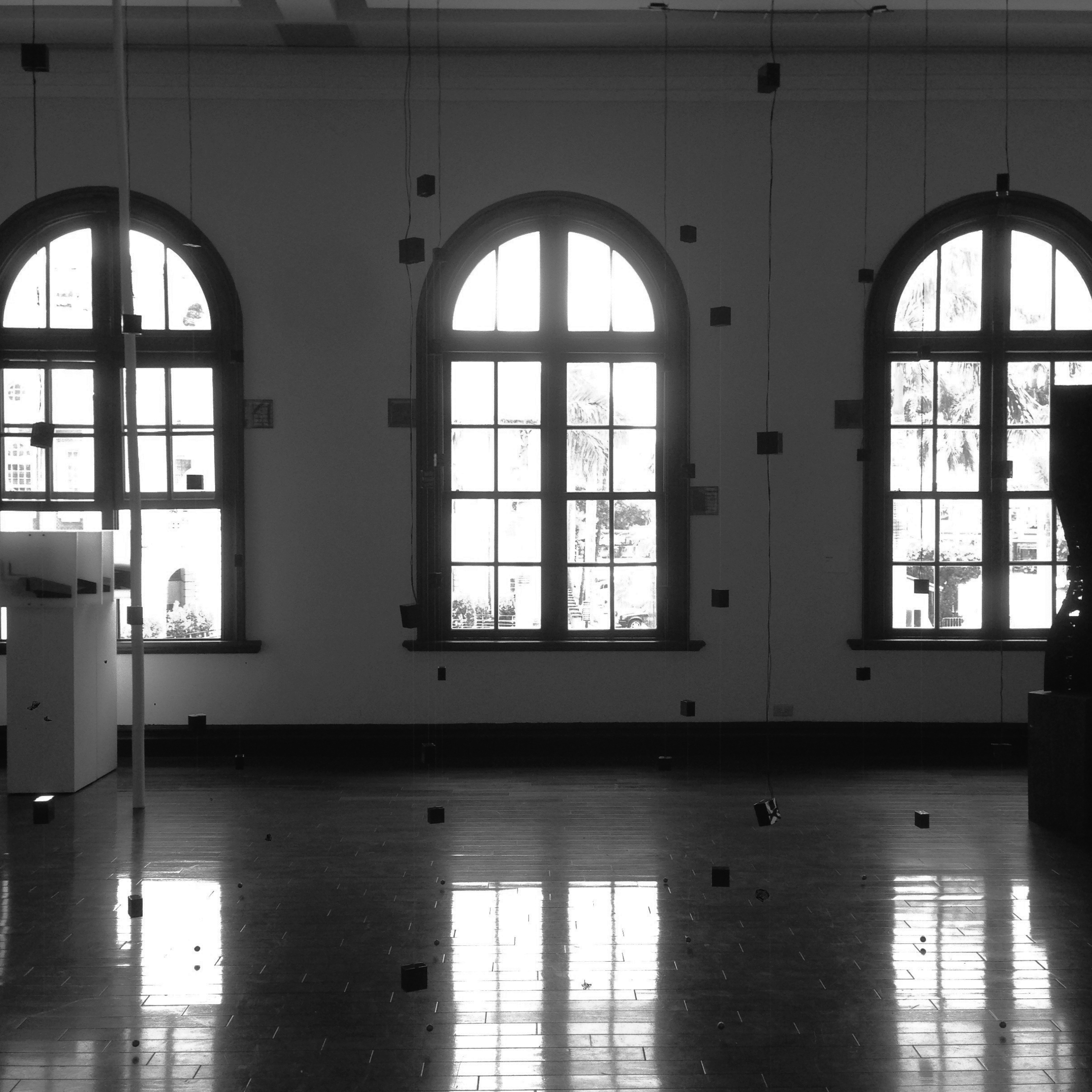 “Sound Space Project #1” was my first on-site sound-related piece. This piece was composed of 16 vertical elements, each of them includes three boxes that string together linearly, in order to create an array “cube”. In total there were 48 black boxes, but only 11 of the boxes were making sounds. The low-tech sound sources were composed by vibrating motors hitting tiny metal elements. Opposite to the matrix cubes, they were arranged circularly as a “sound ring”. The independent variables were the directions and the distance of sounds. In this case, the visitors were not able to tell the shape of sound visually but only when they walk in, they can “hear” the shape of the space.